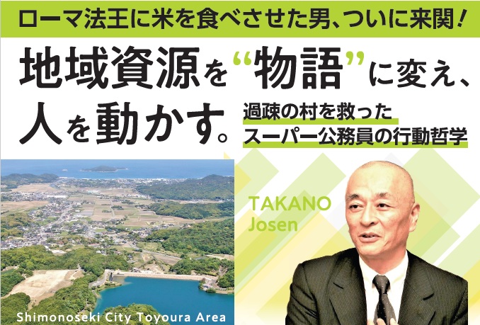 豊浦地域[川棚温泉エリア]再生事業の一環として、高野誠鮮(たかのじょうせん)氏を講師に迎え講演会を開催します。ローマ法王に地域の米を送り、食べていただくことで付加価値を付け、過疎の町を救った「神子原(みこはら)米」のエピソードは有名です。